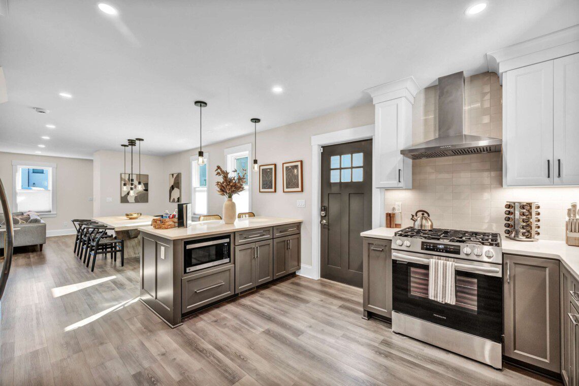 The first floor features a state-of-the-art kitchen, a large dining table that seats 6, with an additional 3 at the peninsula, and a cozy living area with a queen-sized Murphy bed.